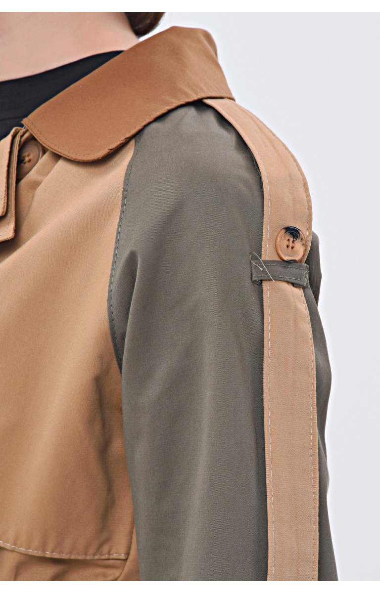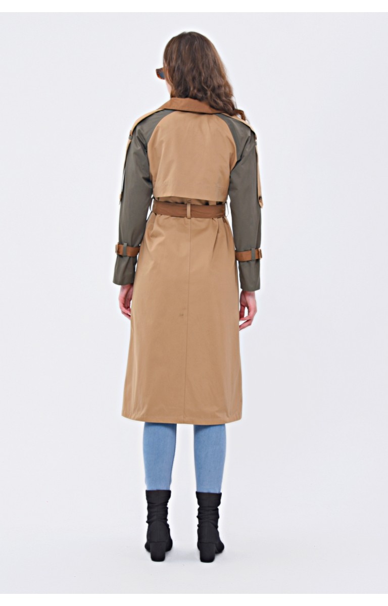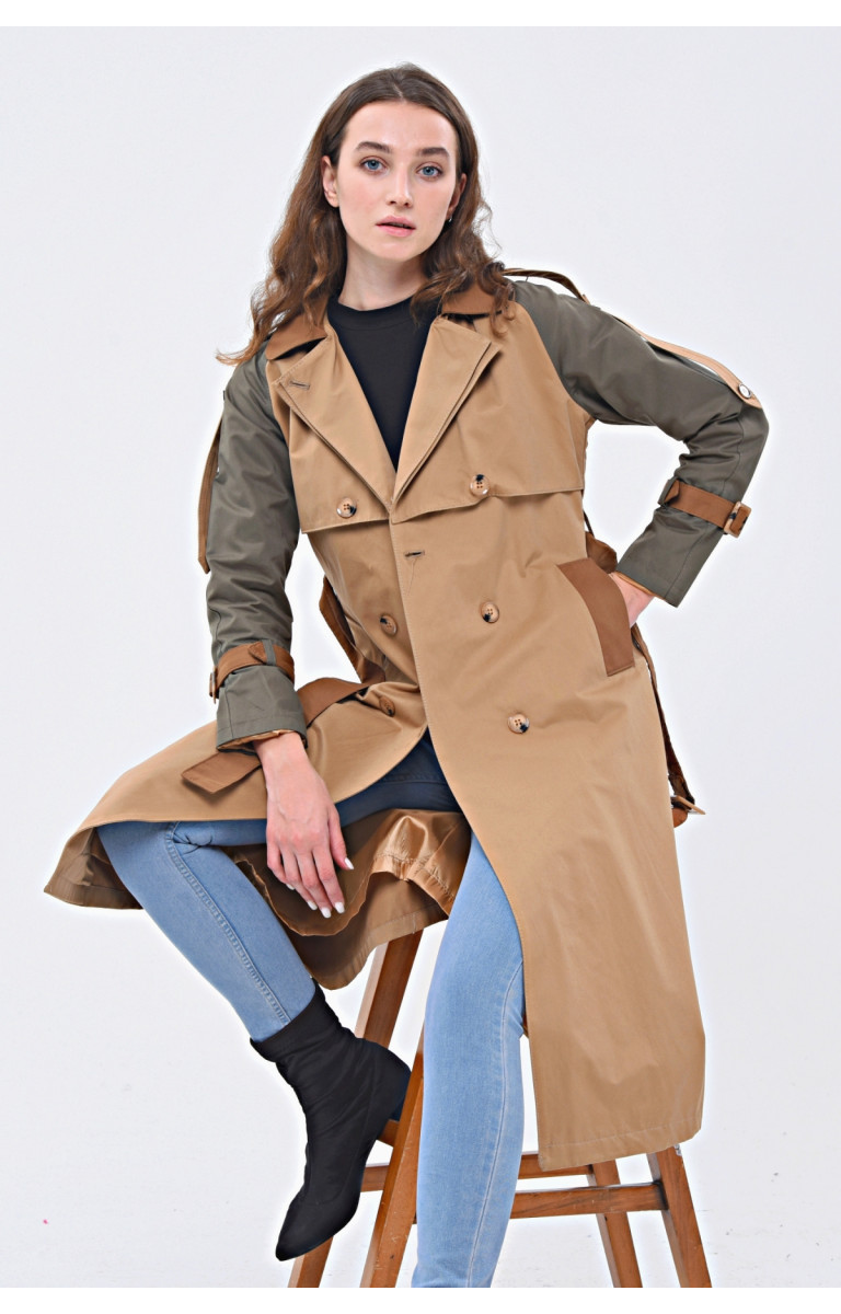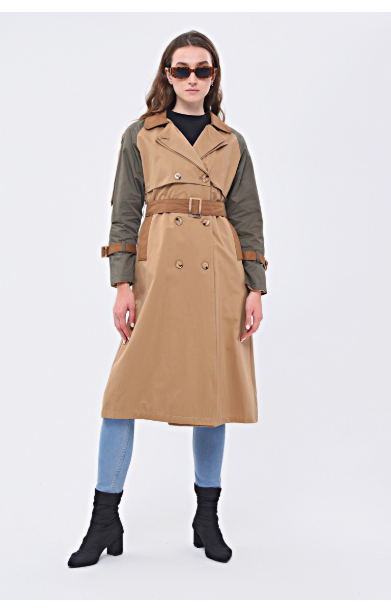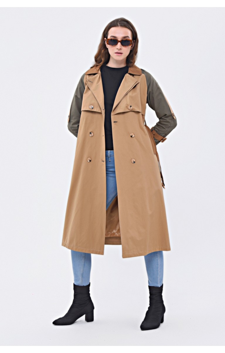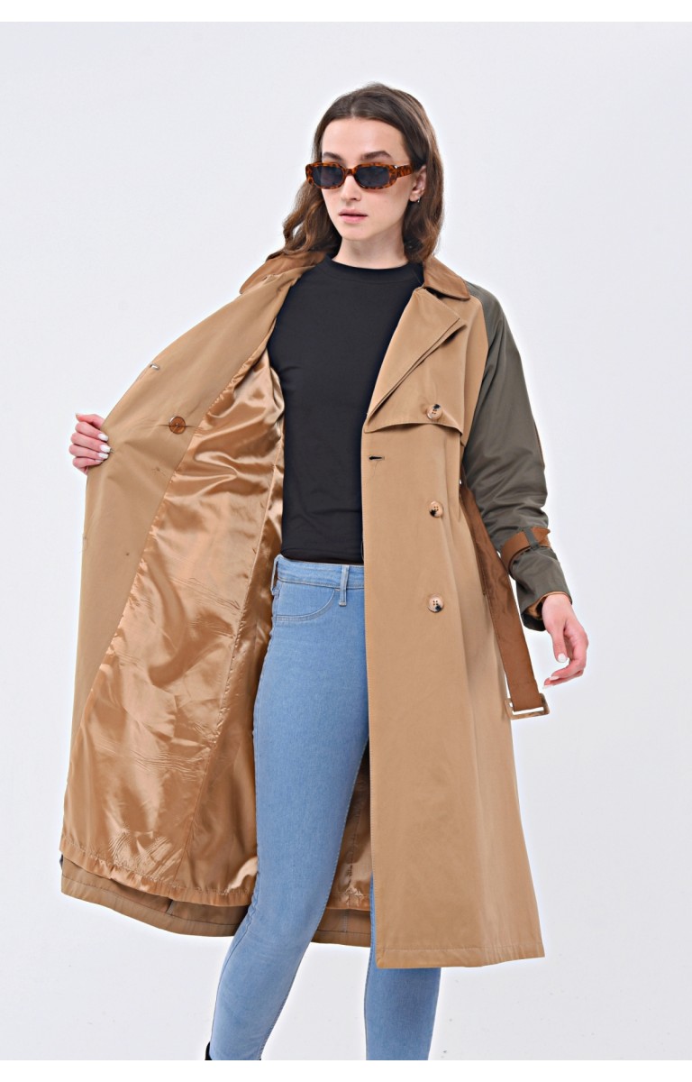 ÜÇ RENKLİ UZUN MEVSİMLİK ASTARLI TRENÇKOT/KAP - KAMEL