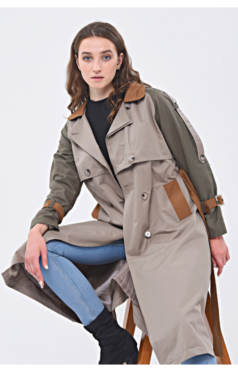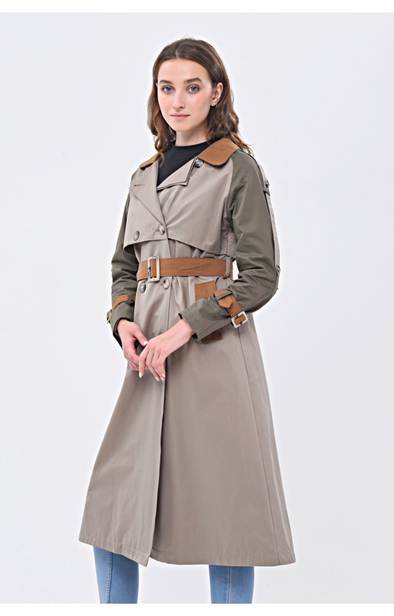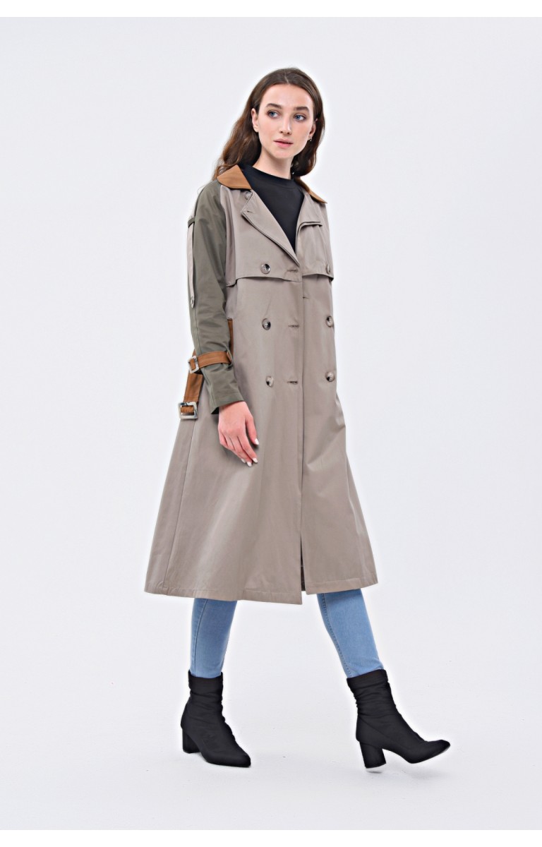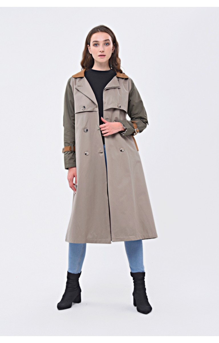 ÜÇ RENKLİ UZUN MEVSİMLİK ASTARLI TRENÇKOT/KAP - VİZON