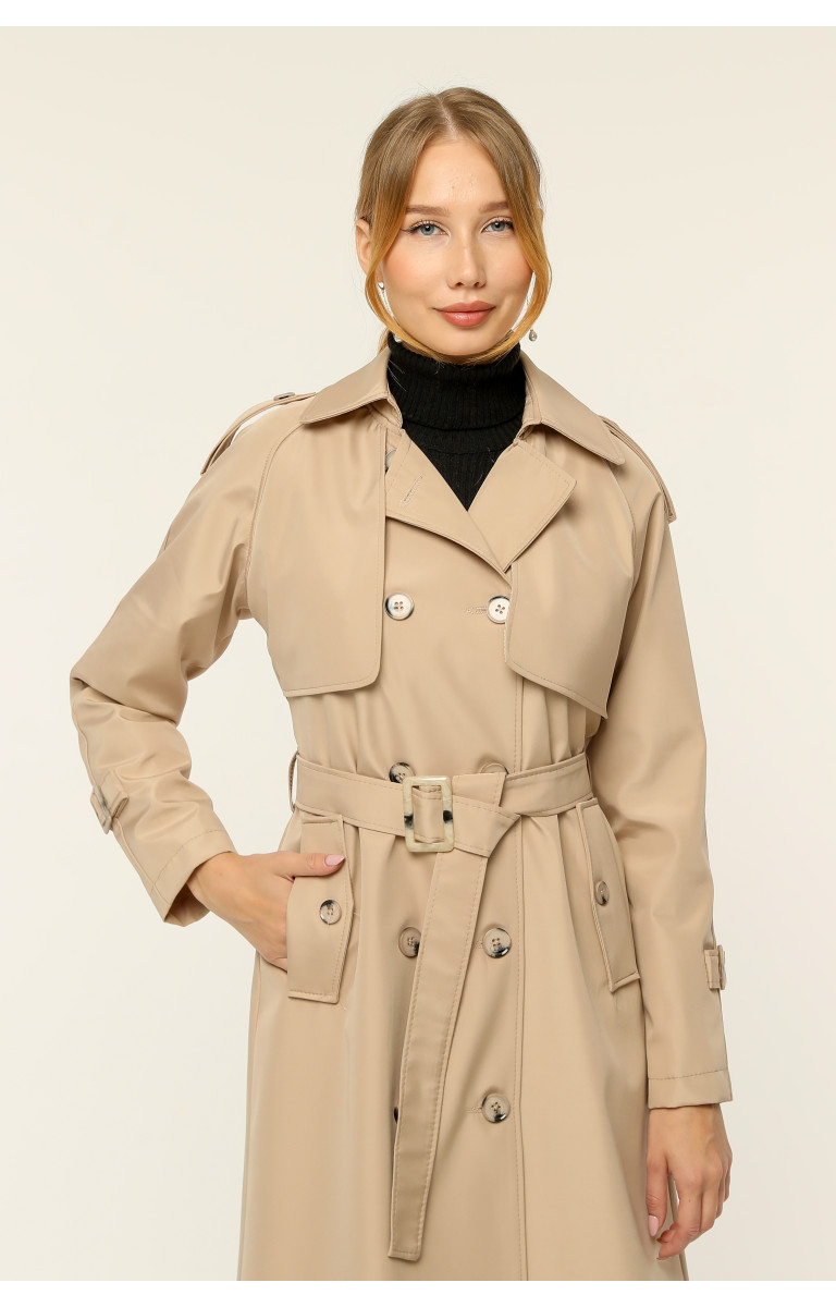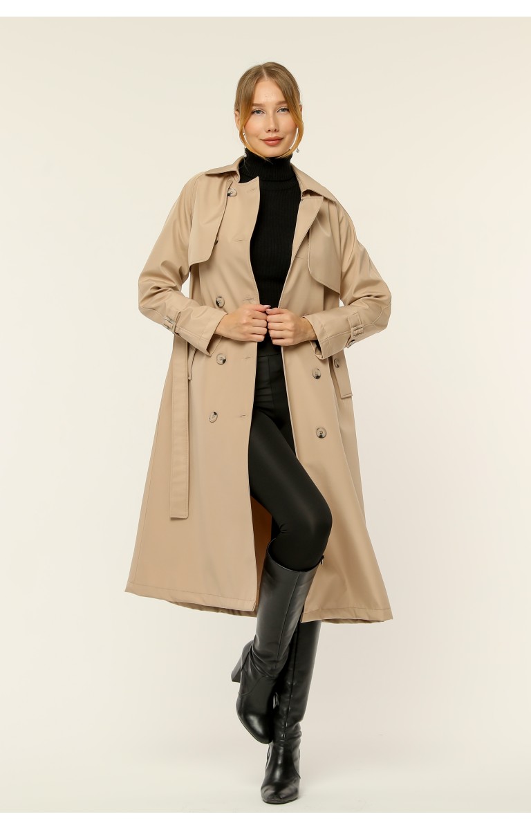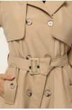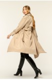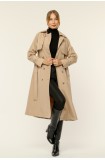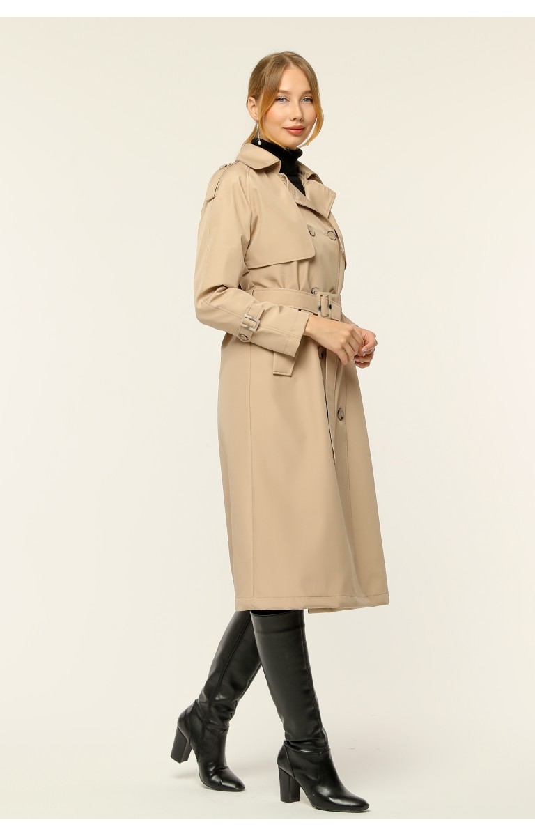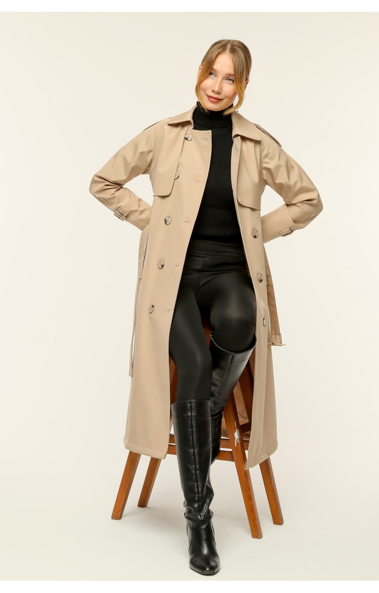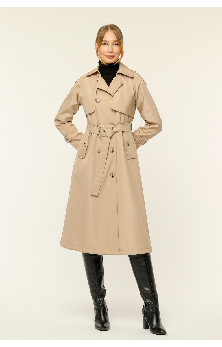 Çift Cepkenli Mevsimlik Bondit Kumaş uzun Kadın Trençkot-Bej