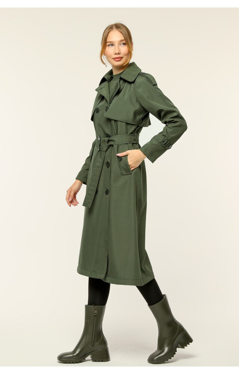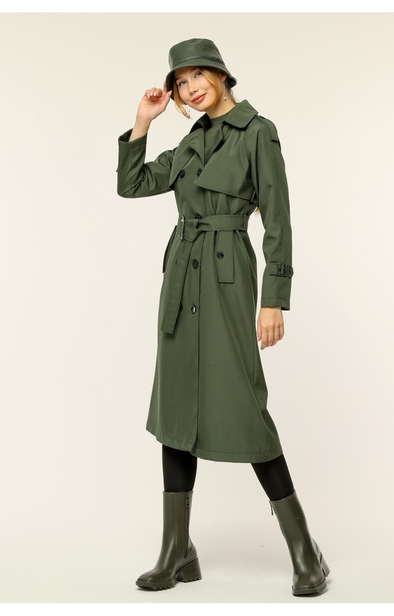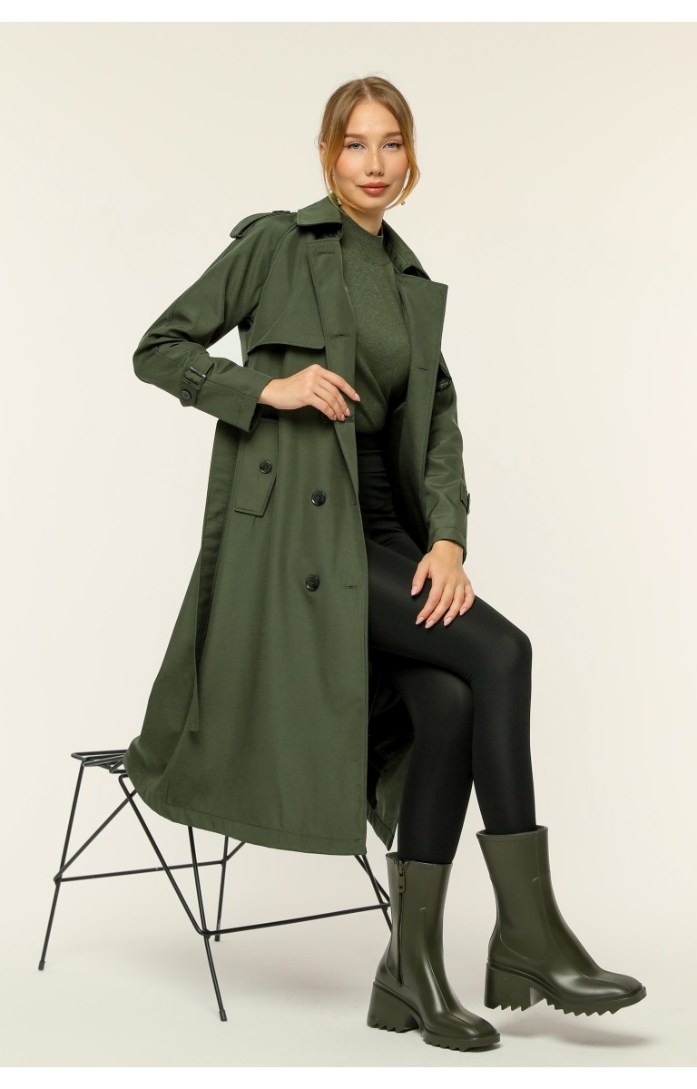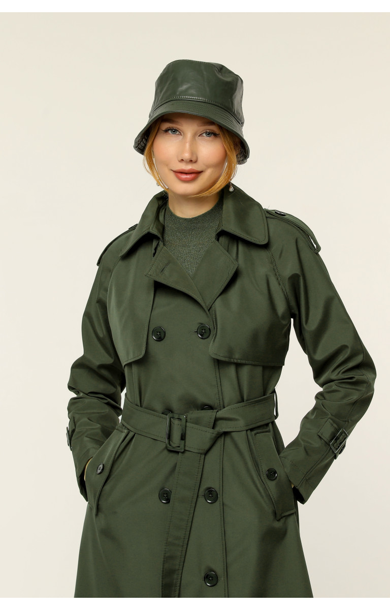 Çift Cepkenli Mevsimlik Bondit Kumaş uzun Kadın Trençkot-Haki