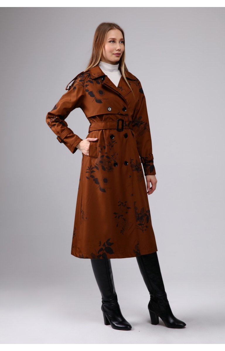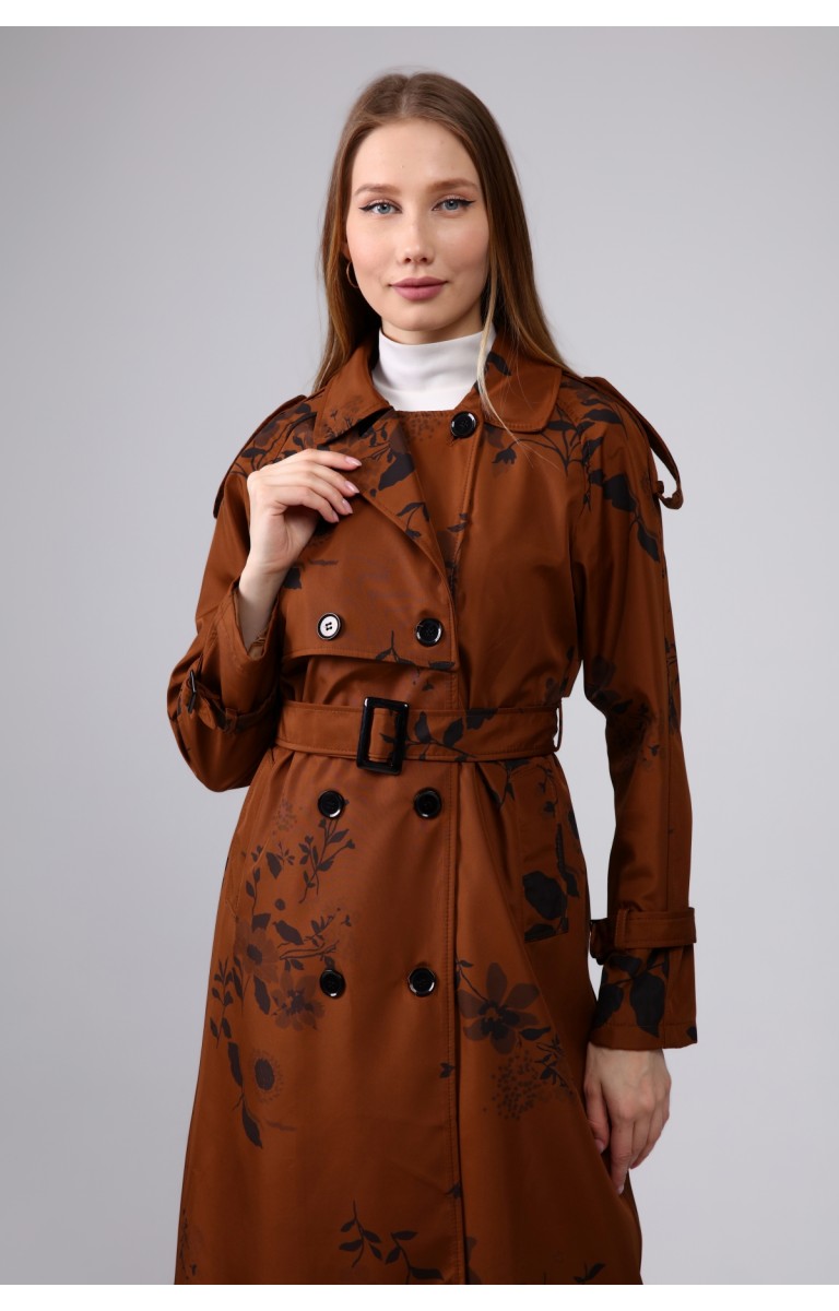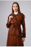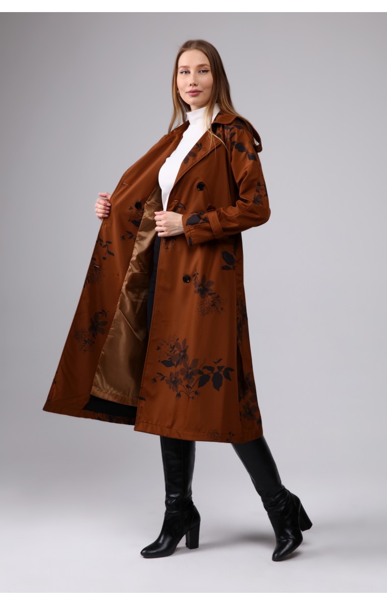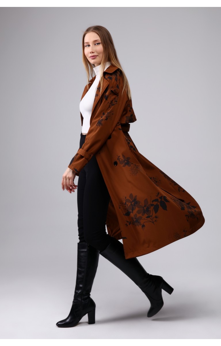 Çiçek Desenli Astarlı Uzun Kadın Trençkot - TABA