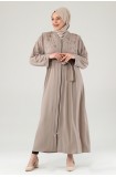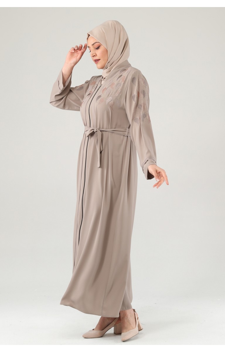 Jamila Yaprak Desenli Nakışlı Taşlı Kadın Ferace - BEJ