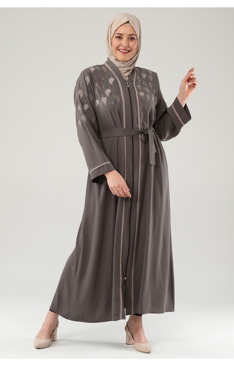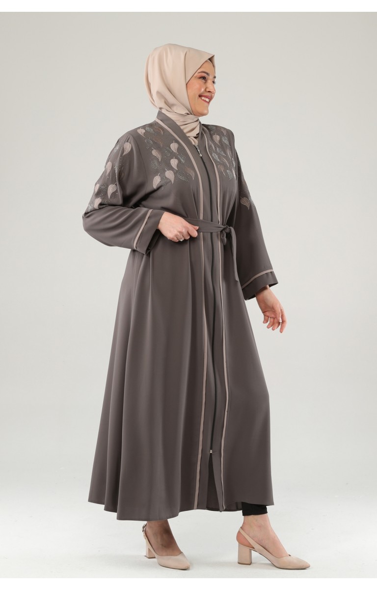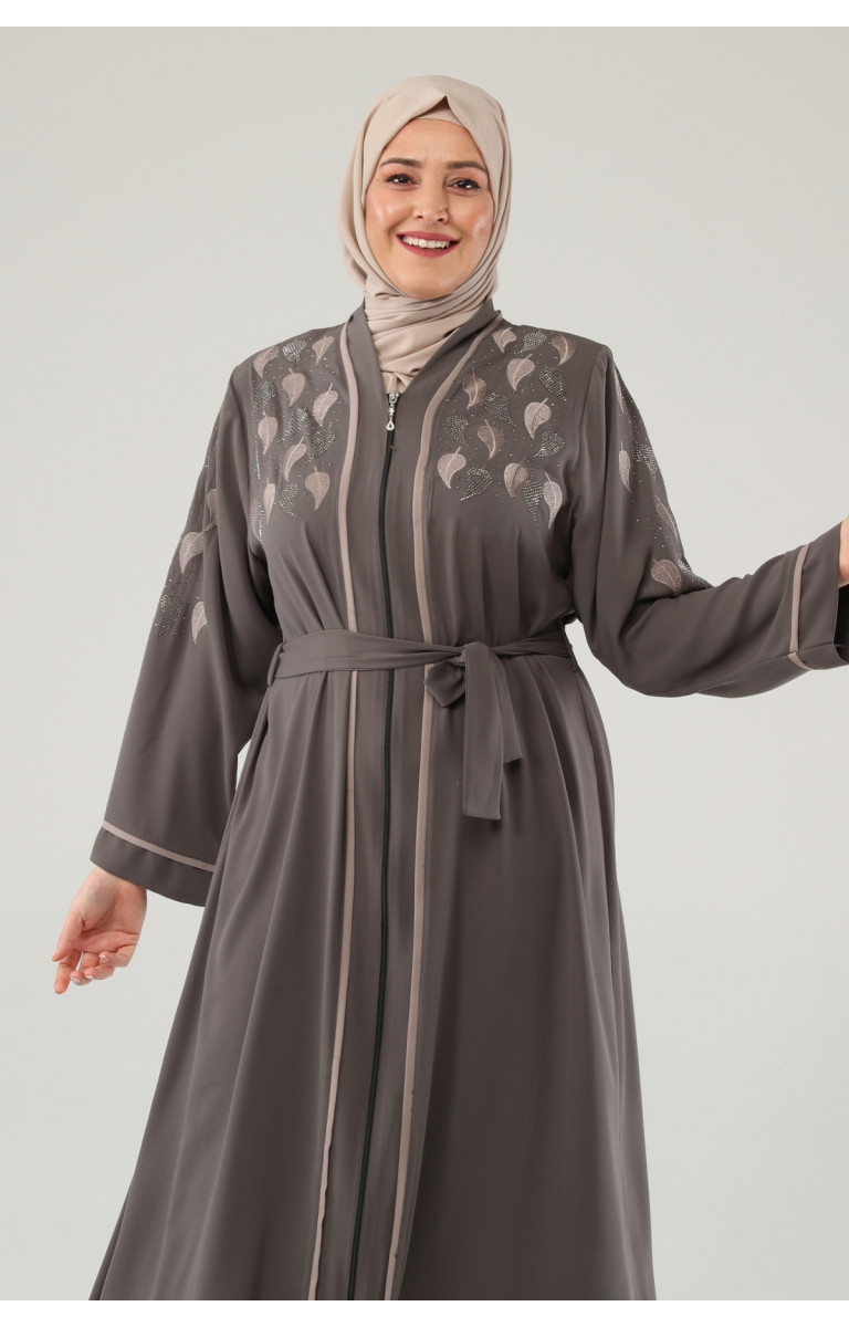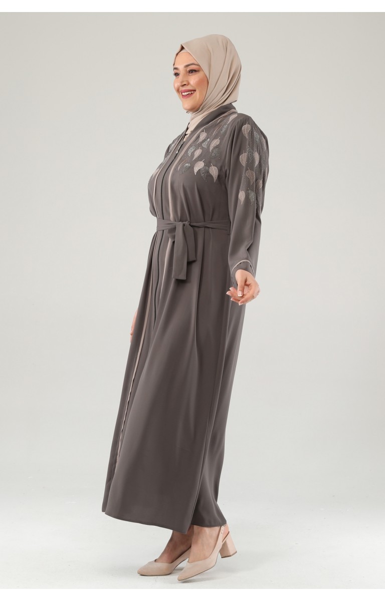 Jamila Yaprak Desenli Nakışlı Taşlı Kadın Ferace - VİZON
