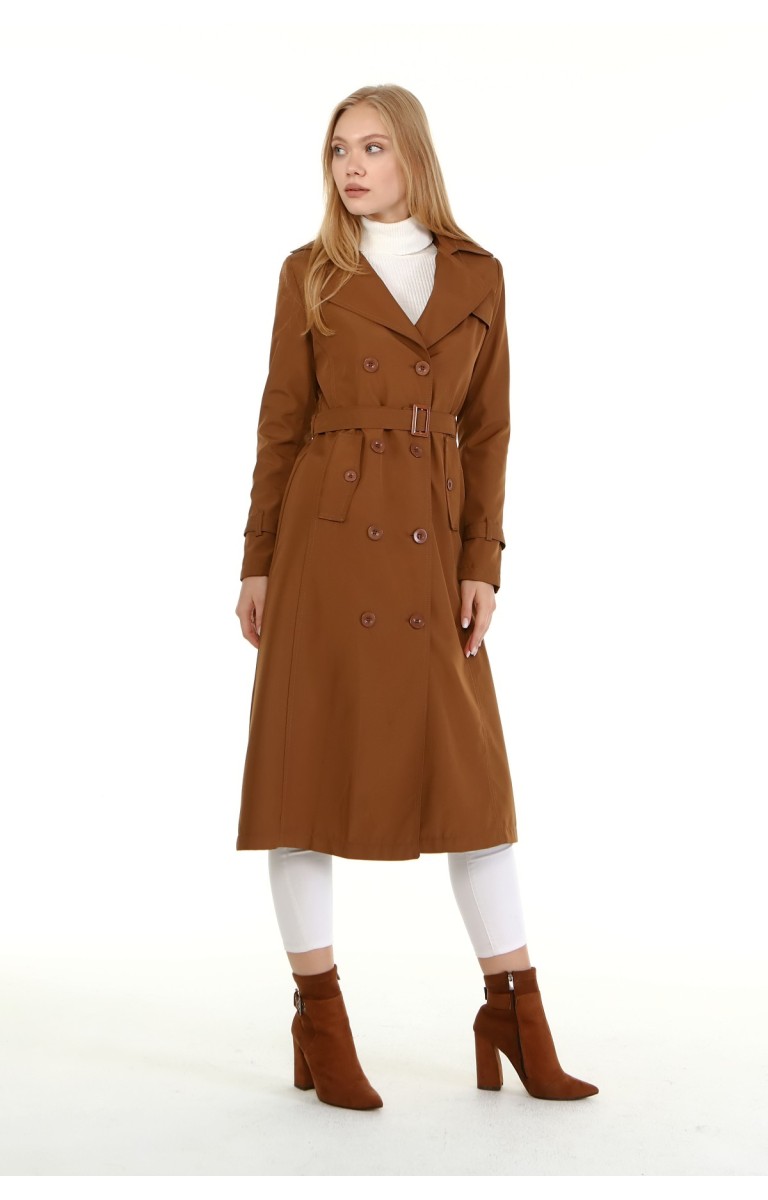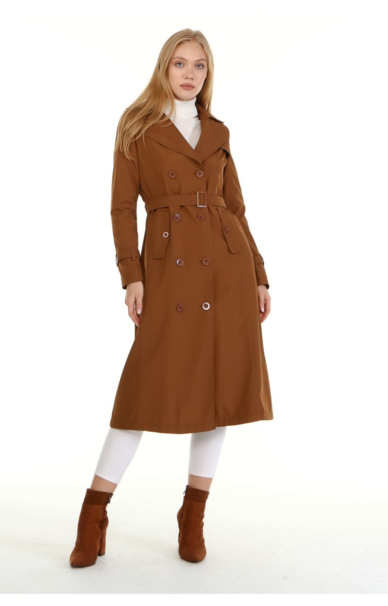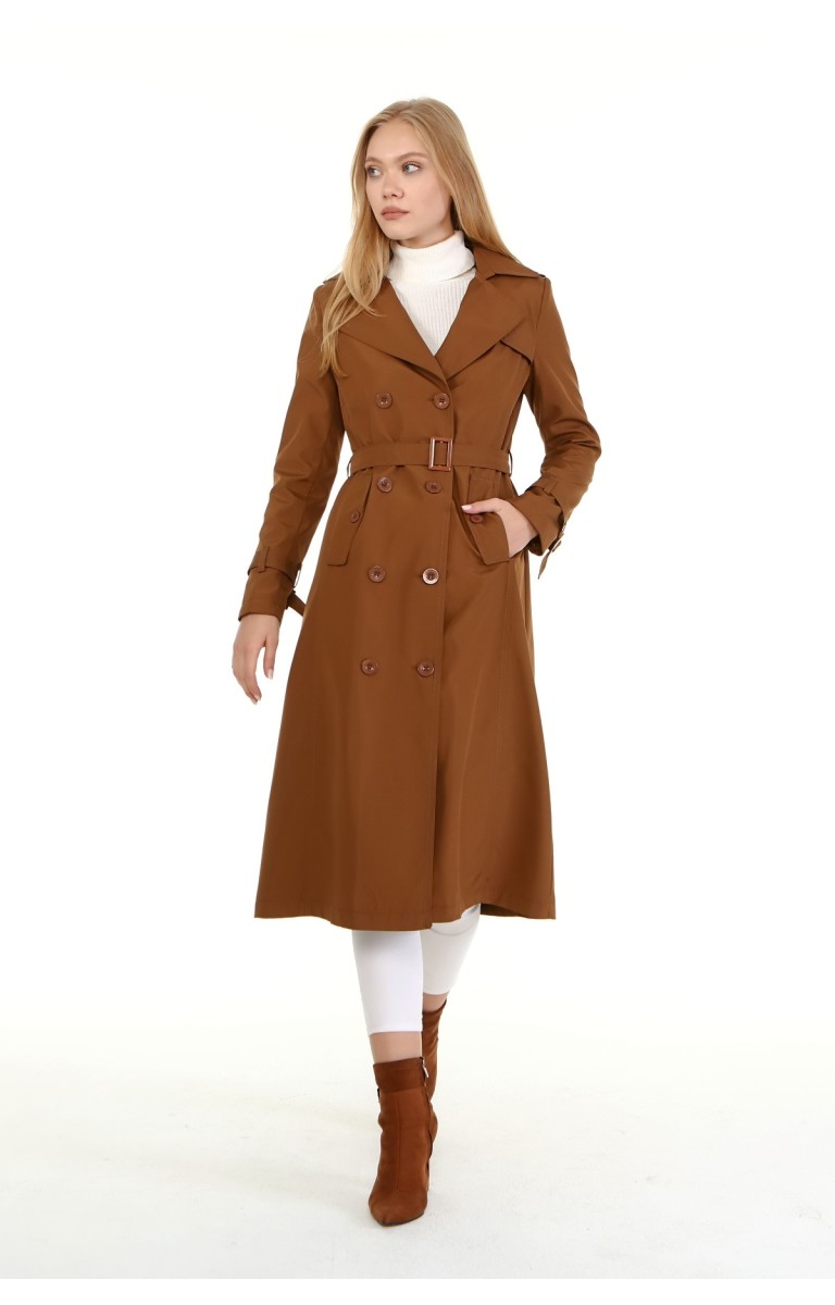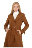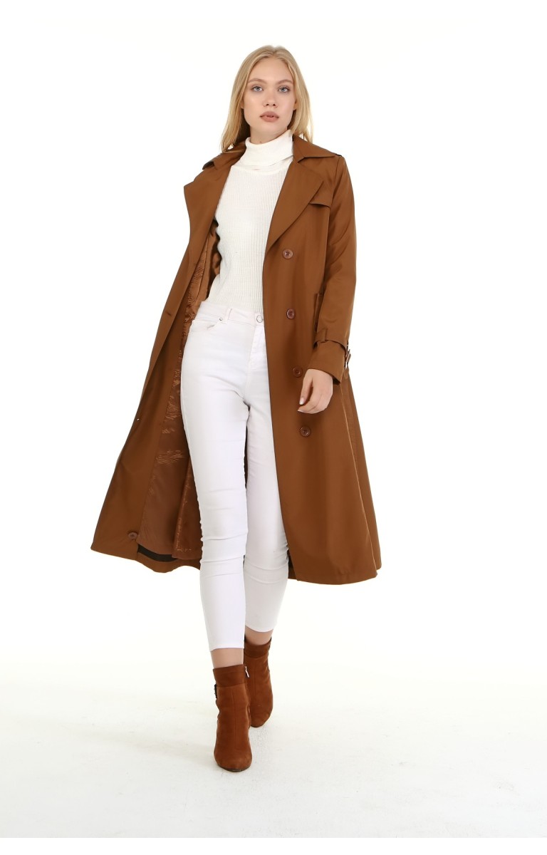 Uzun Büyük Beden Kadın Astarlı Trençkot-Taba