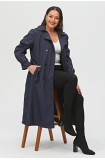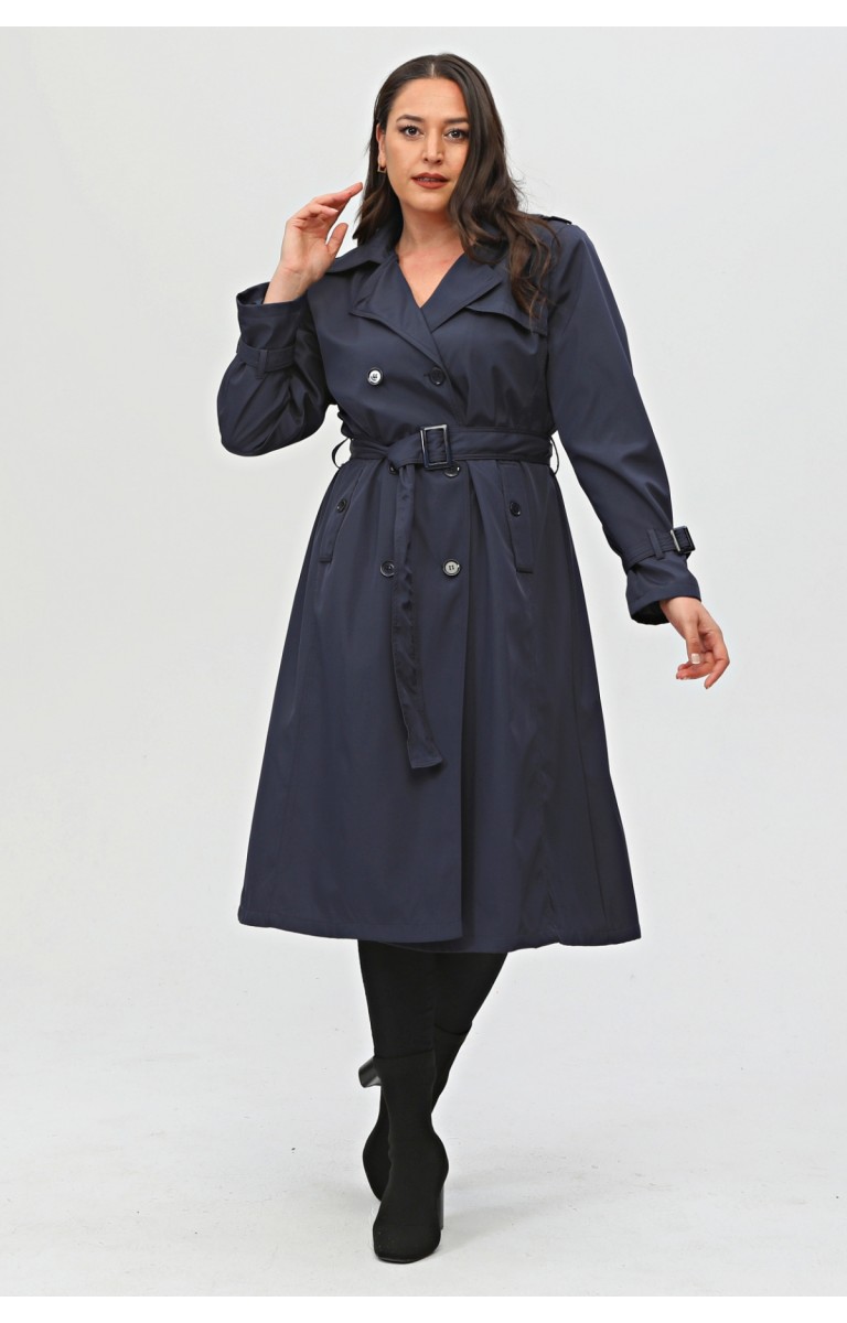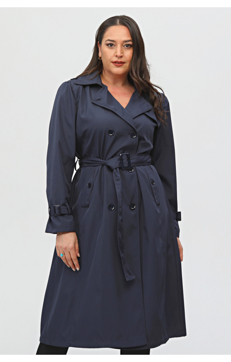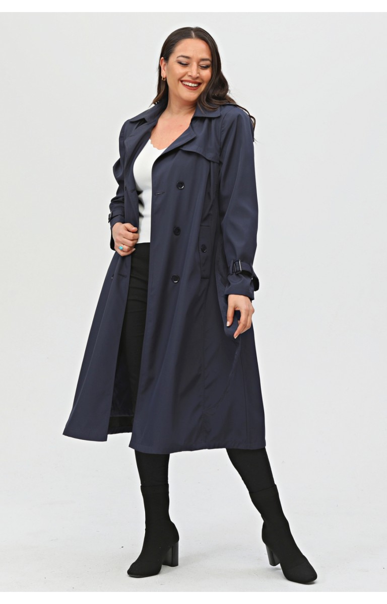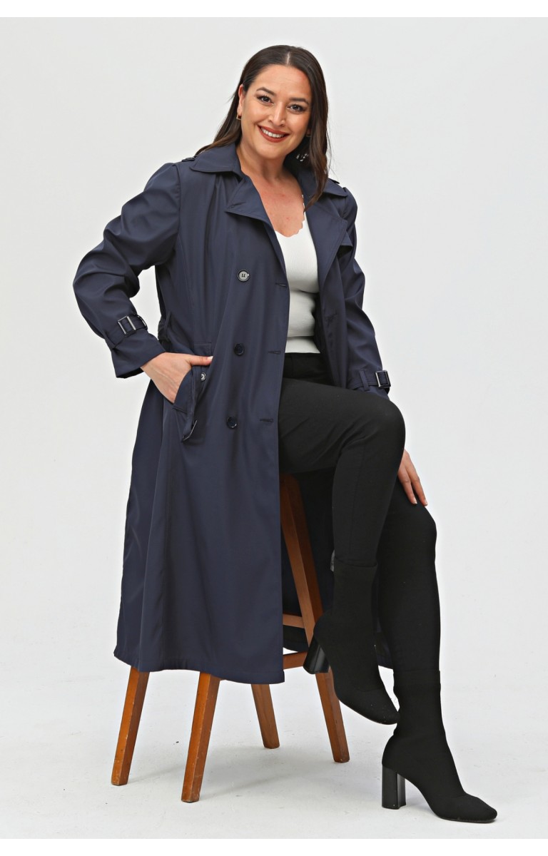 Uzun Büyük Beden Kadın Astarlı Trençkot-Lacivert
