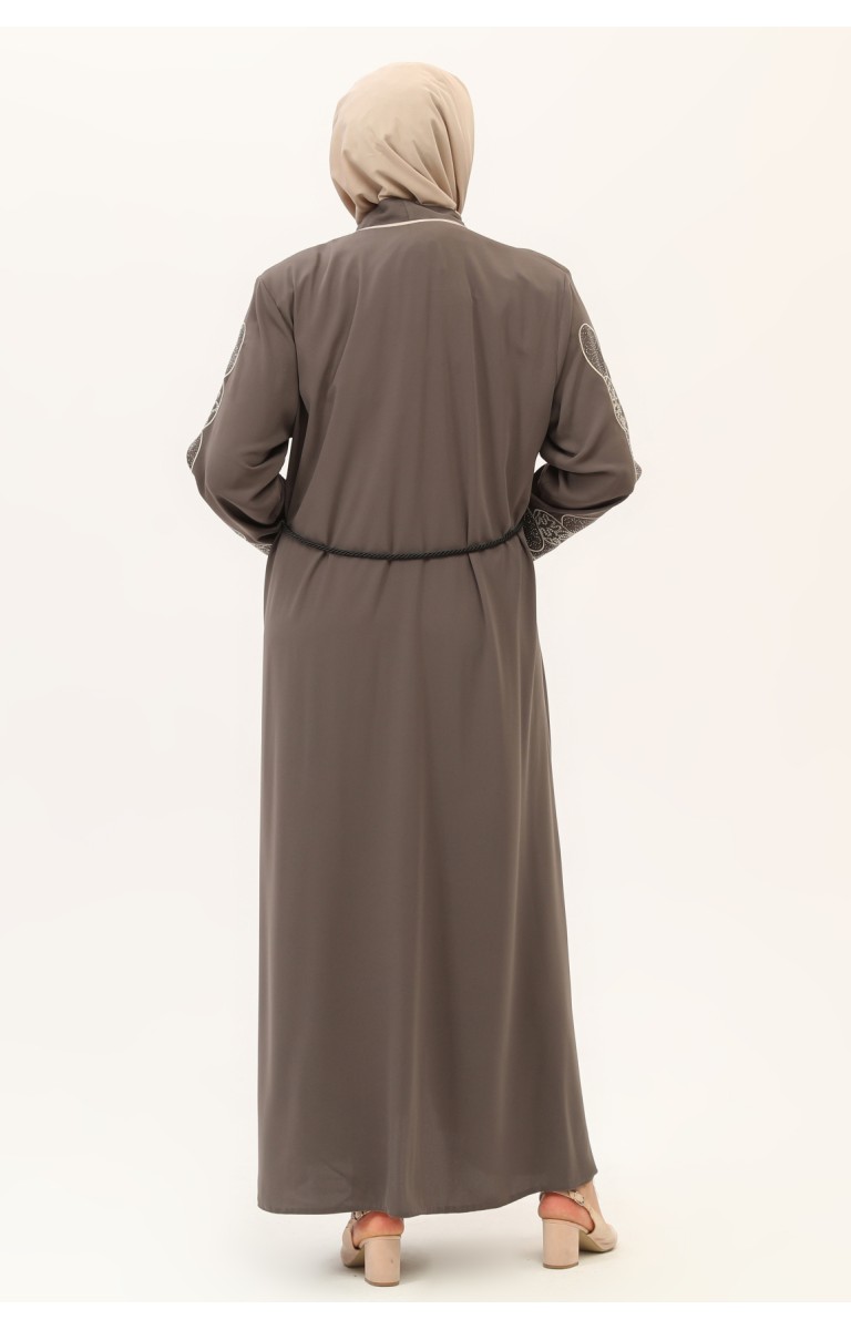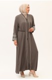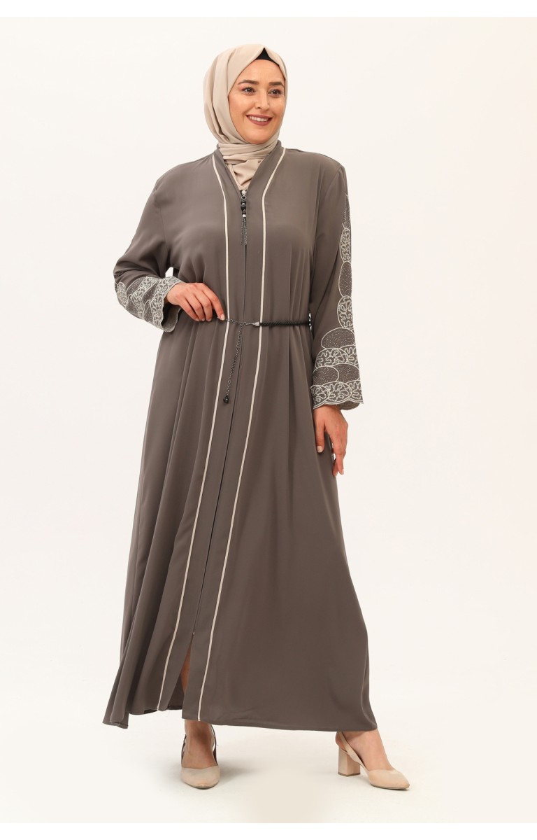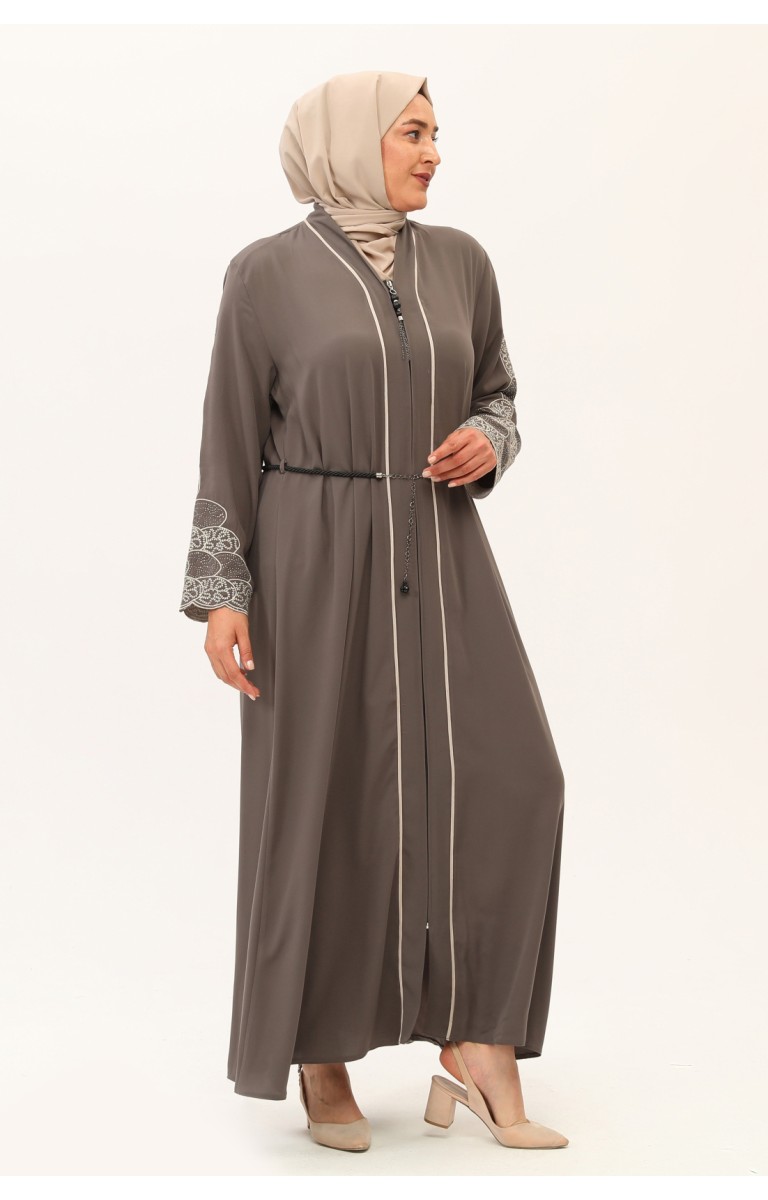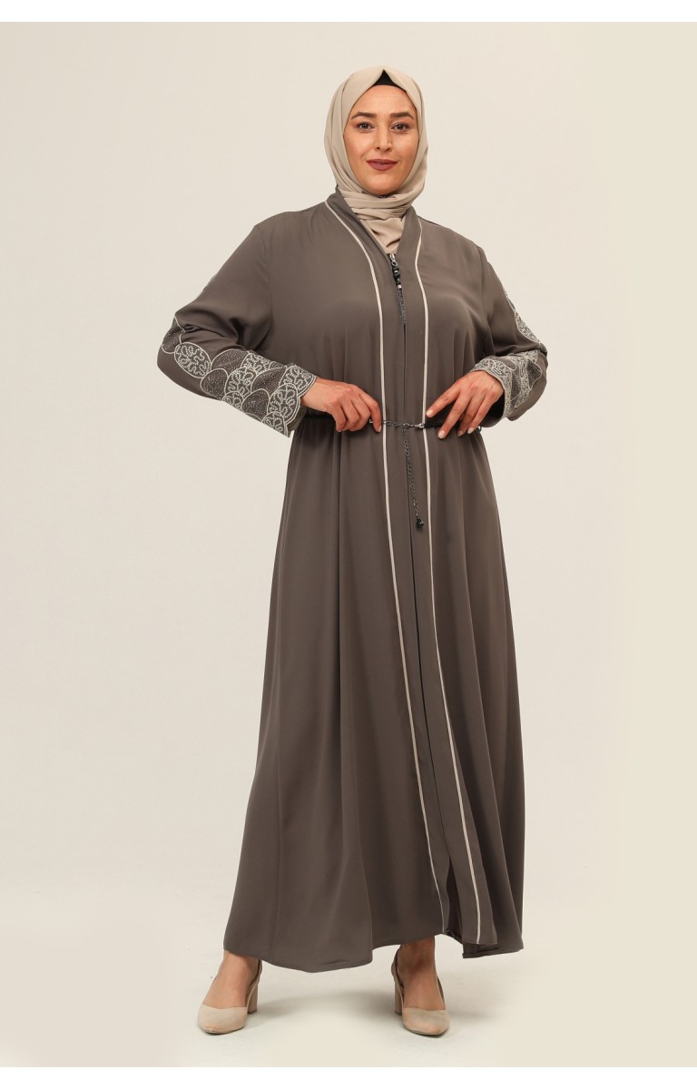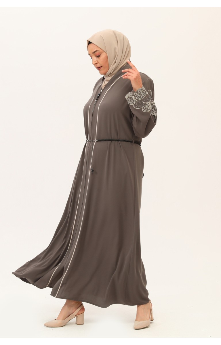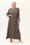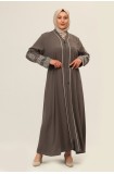 BÜYÜK BEDEN NAKIŞLI VE TAŞLI KREP KUMAŞ KADIN BÜYUK BEDEN FERACE - VİZON