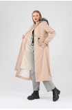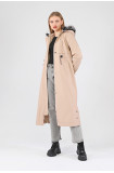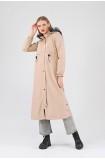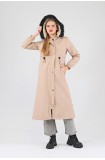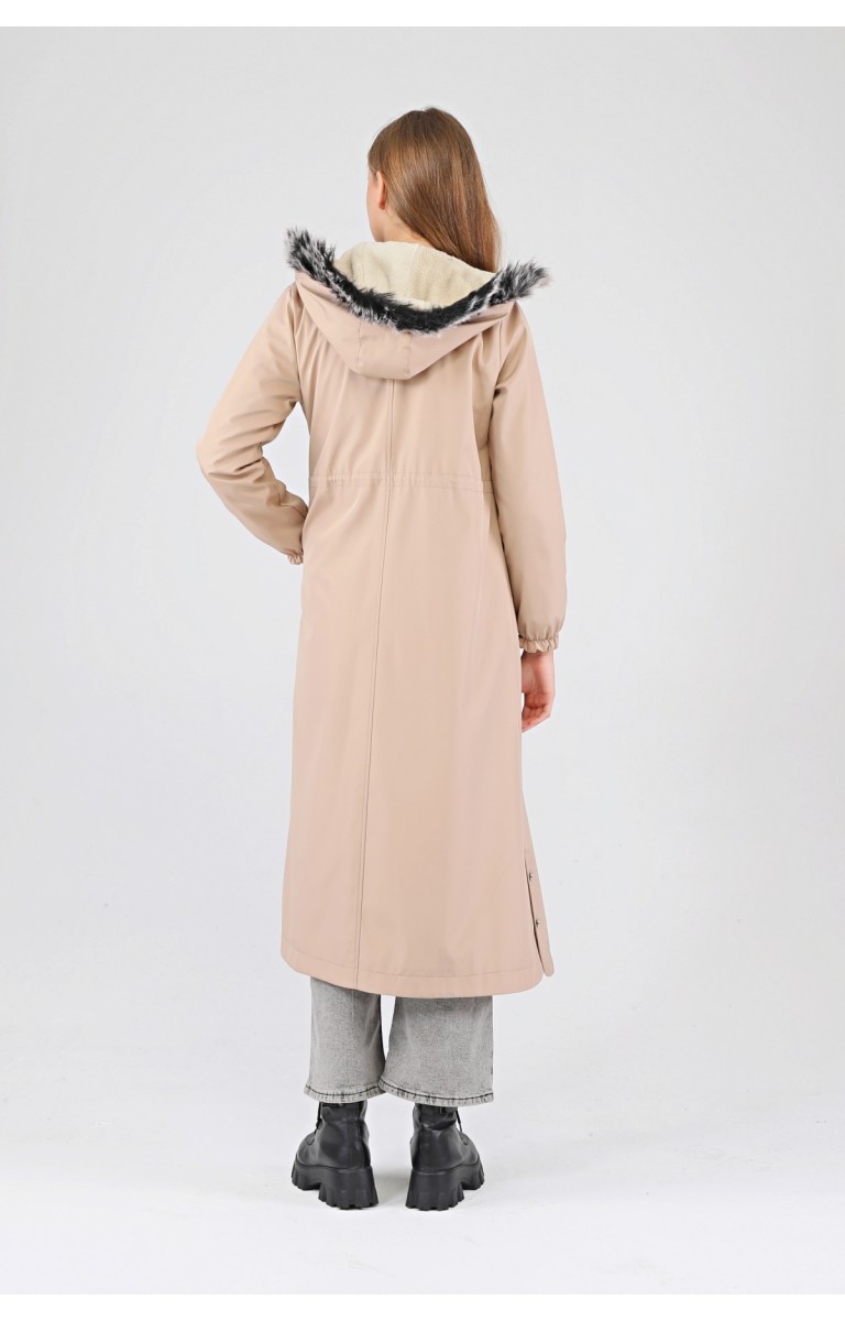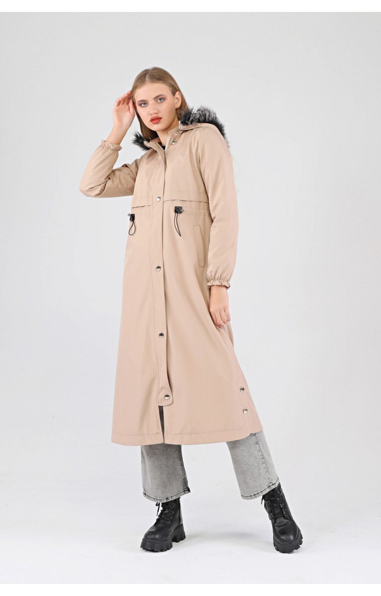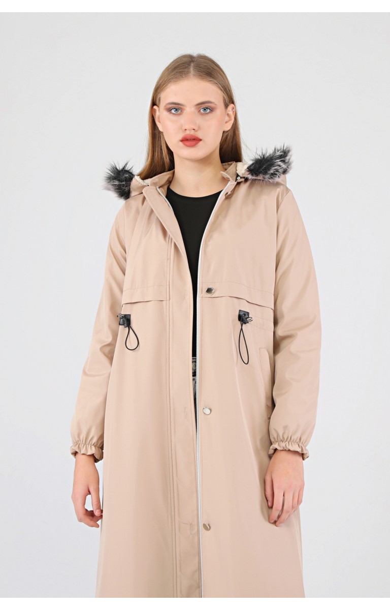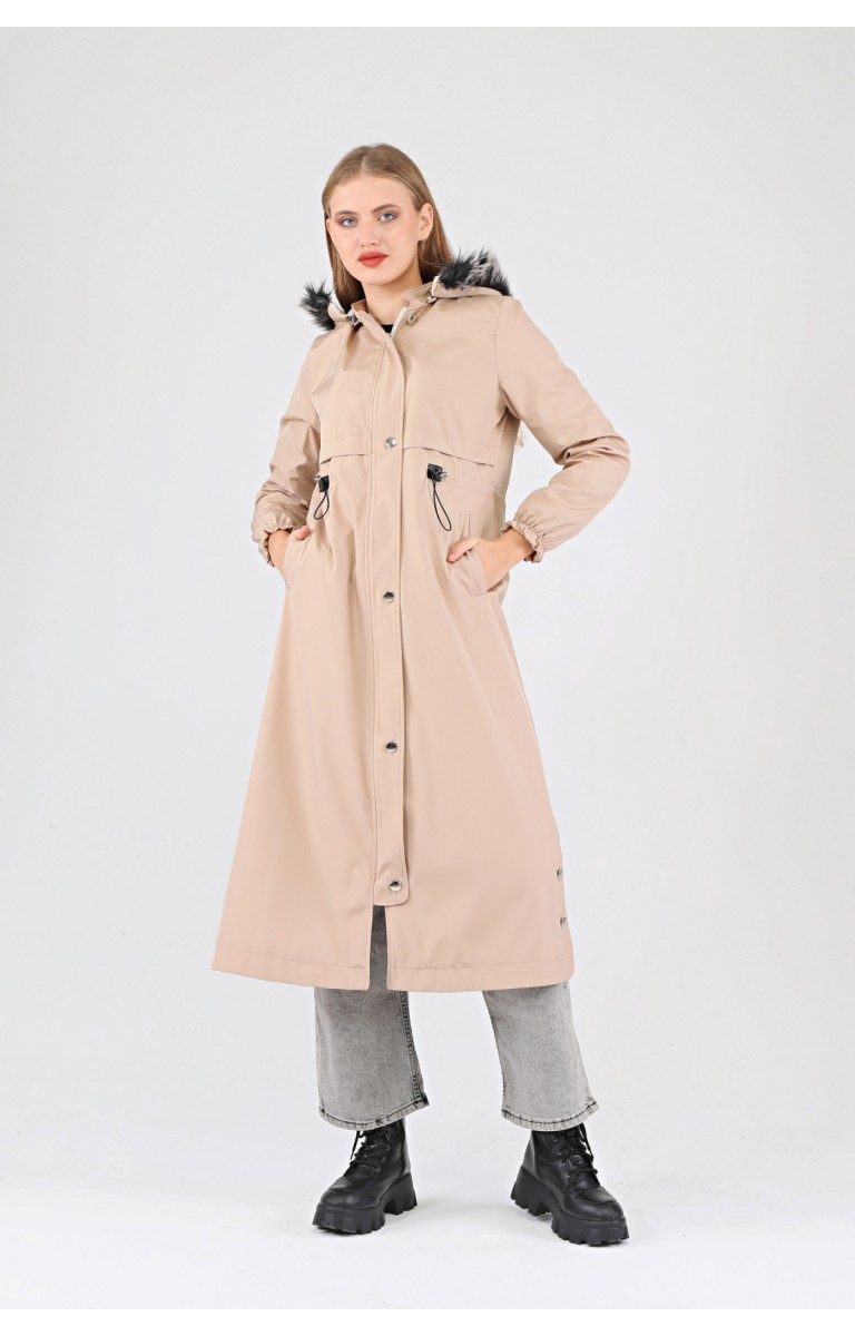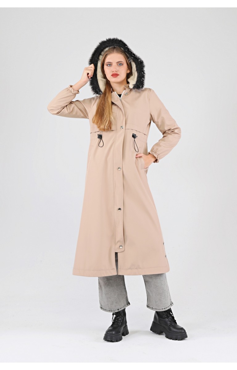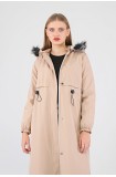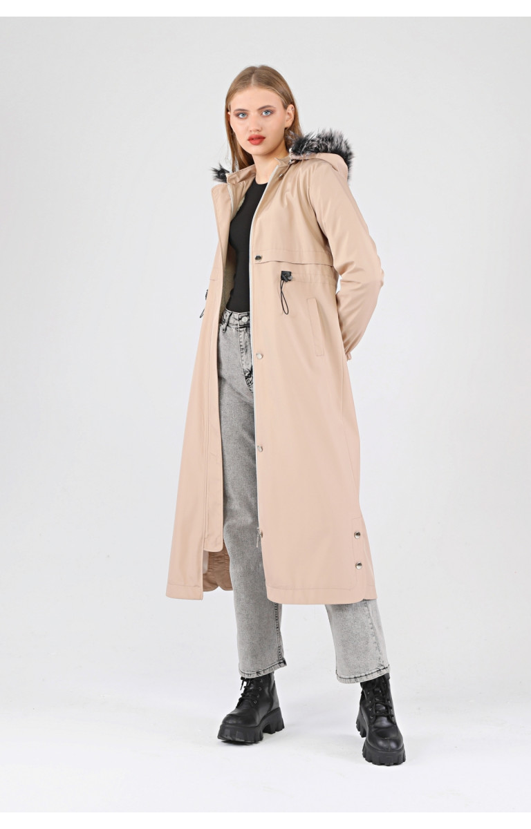 Kışlık Uzun Kadın Kürklü Kapüşonlu Trençkot - BEJ