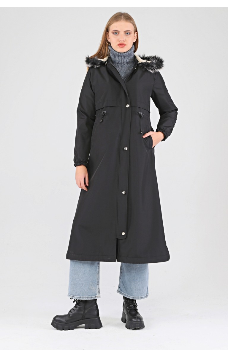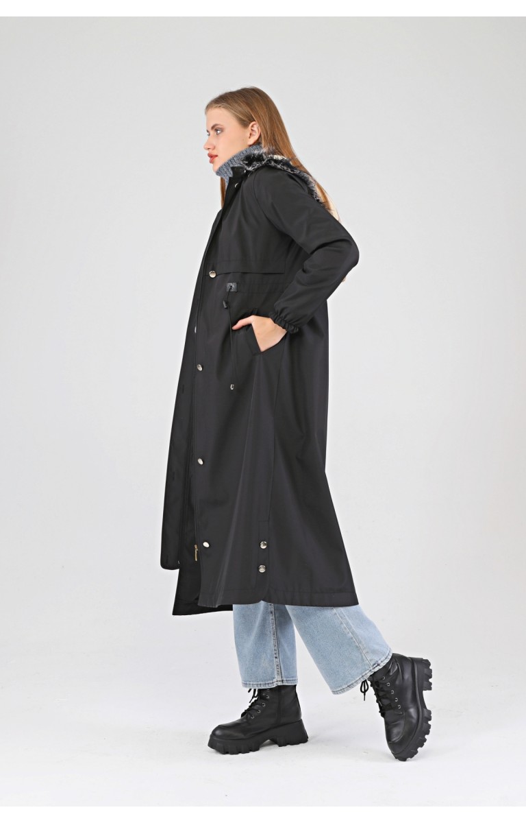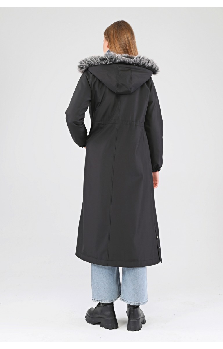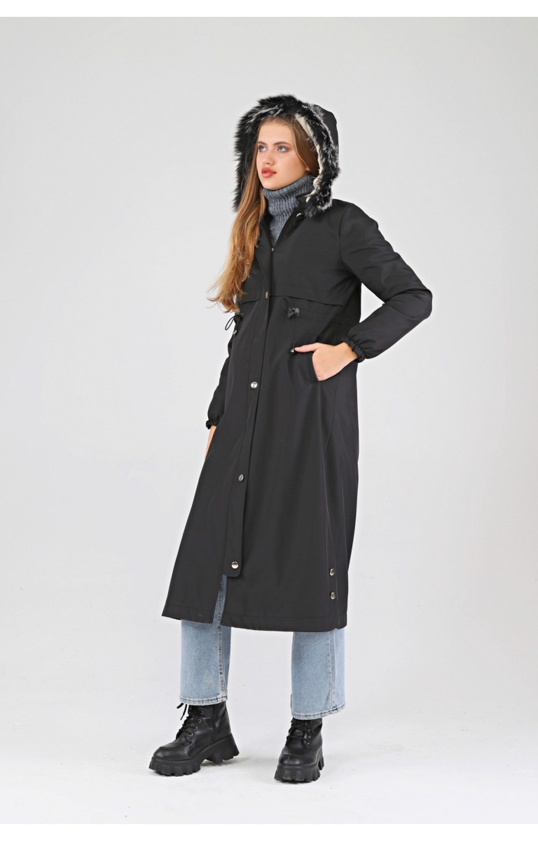 Kışlık Uzun Kadın Kürklü Kapüşonlu Trençkot - SİYAH
