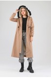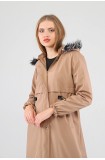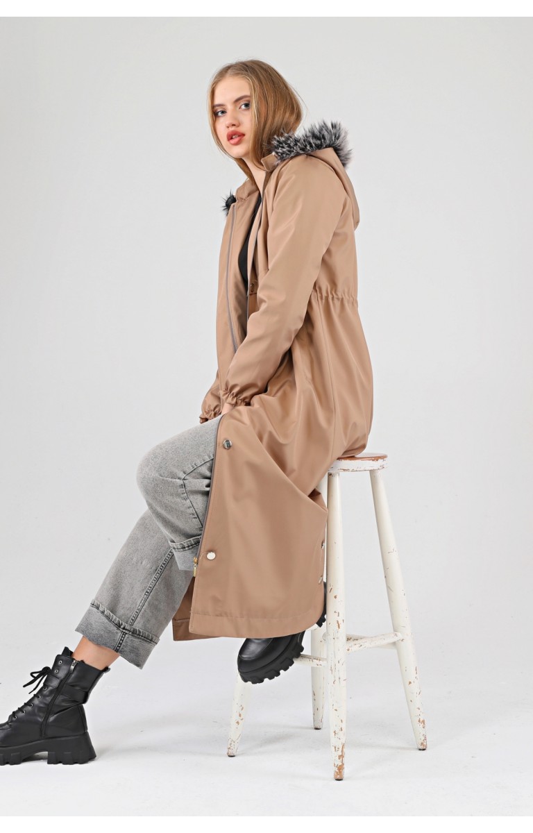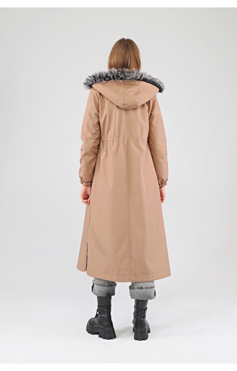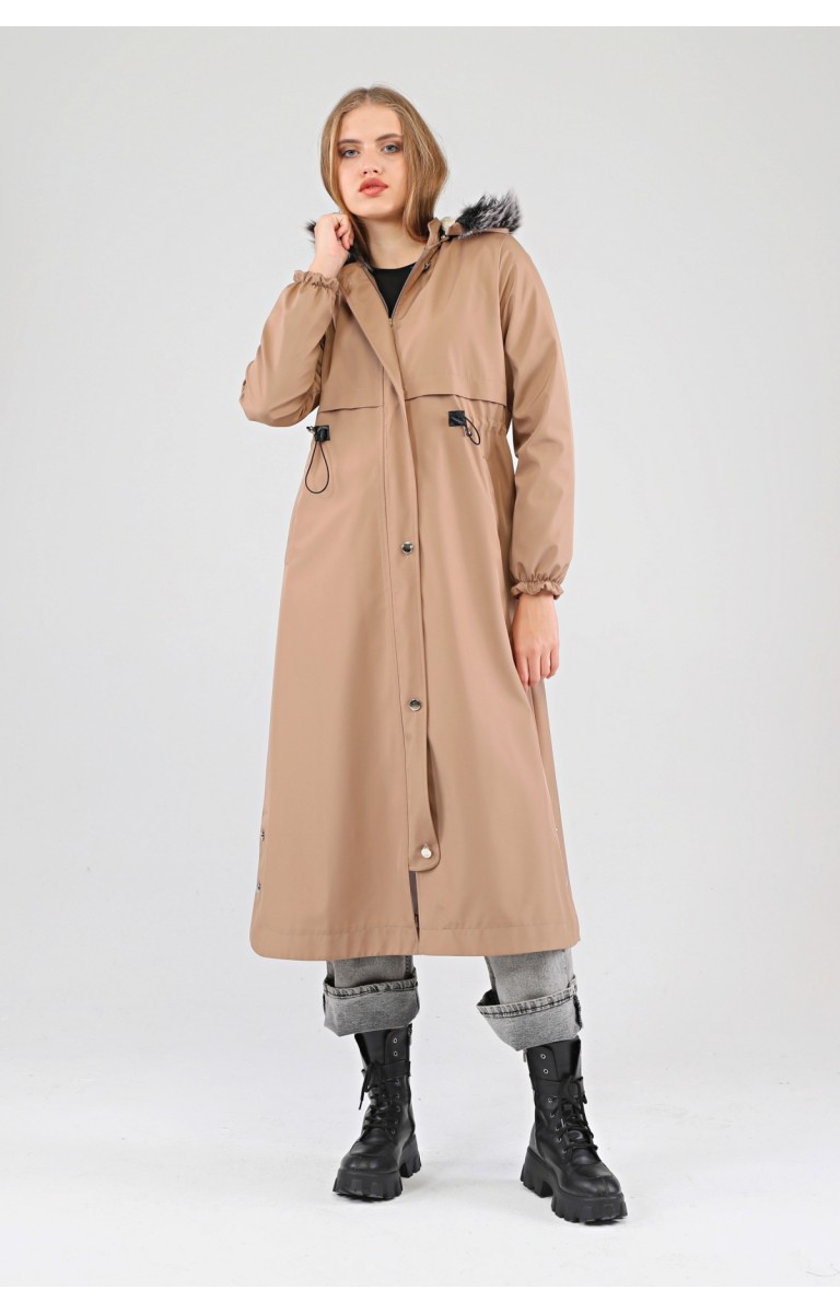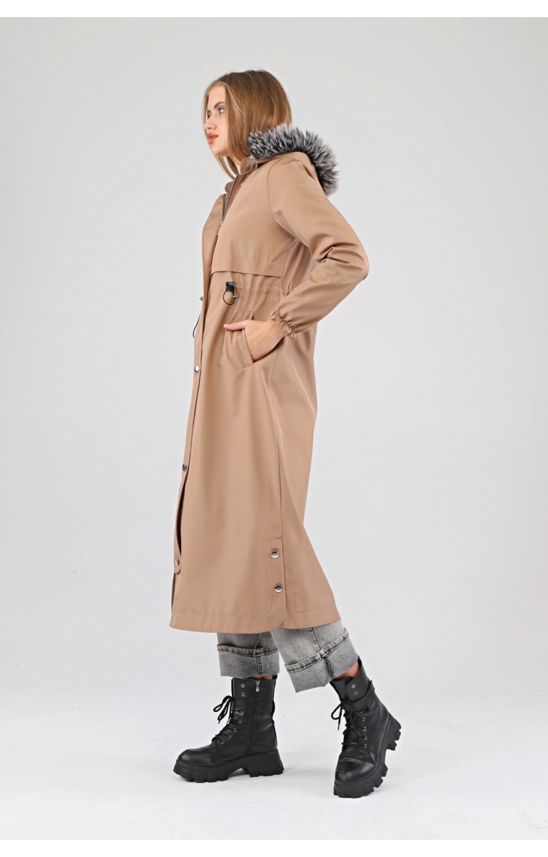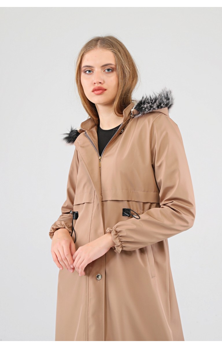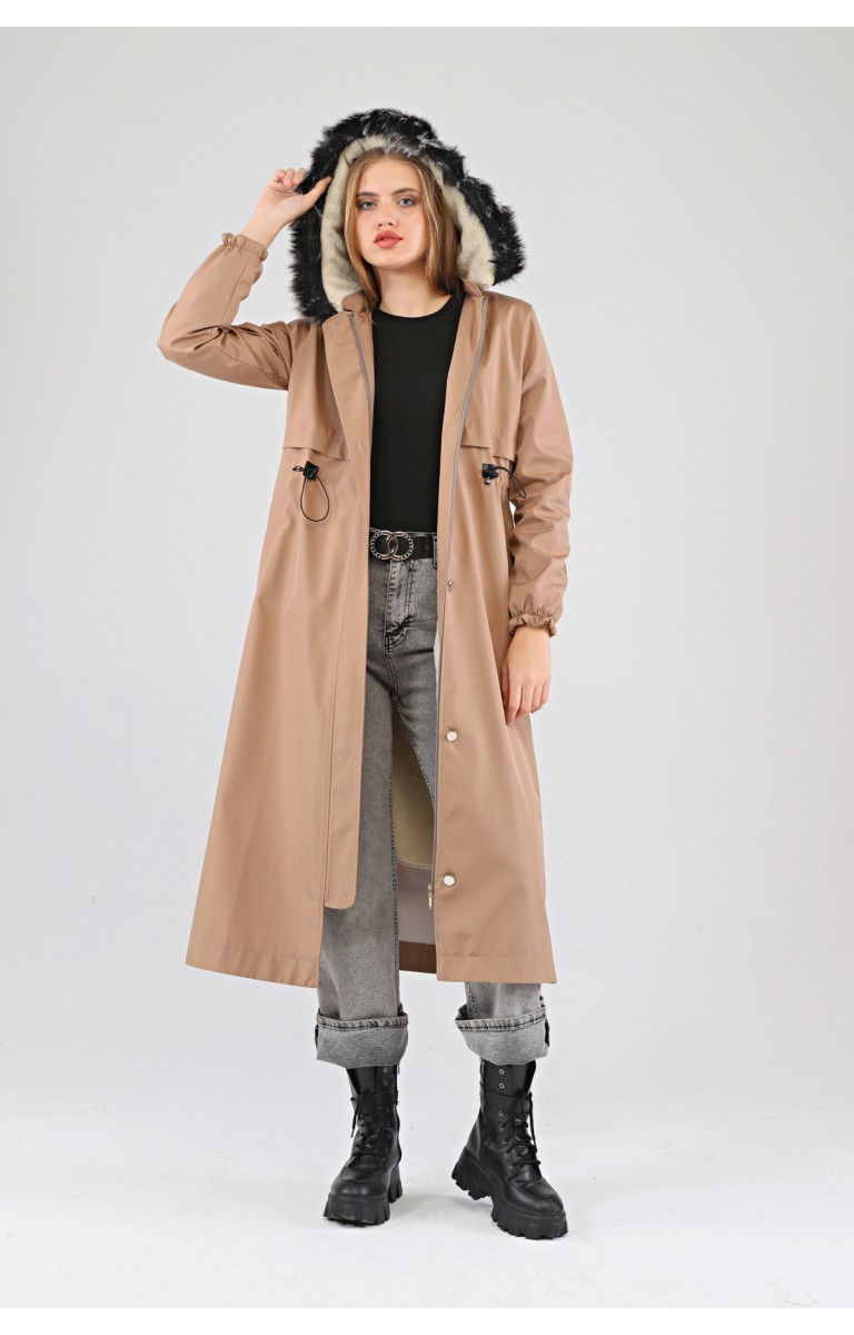Kışlık Uzun Kadın Kürklü Kapüşonlu Trençkot - VİZON