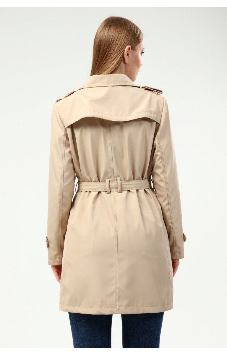 SU İTİCİ BONDİT KUMAŞTAN İMAL EDİLMİŞ %100 POLYESTER YAPISI SAYESİNDE ESNEK, KIRIŞMAYA DAYANIKLI VE NEFES ALICI ÖZELLİKLERE SAHİP, KALİTELİ KISA BOY KADIN TRENÇKOT.